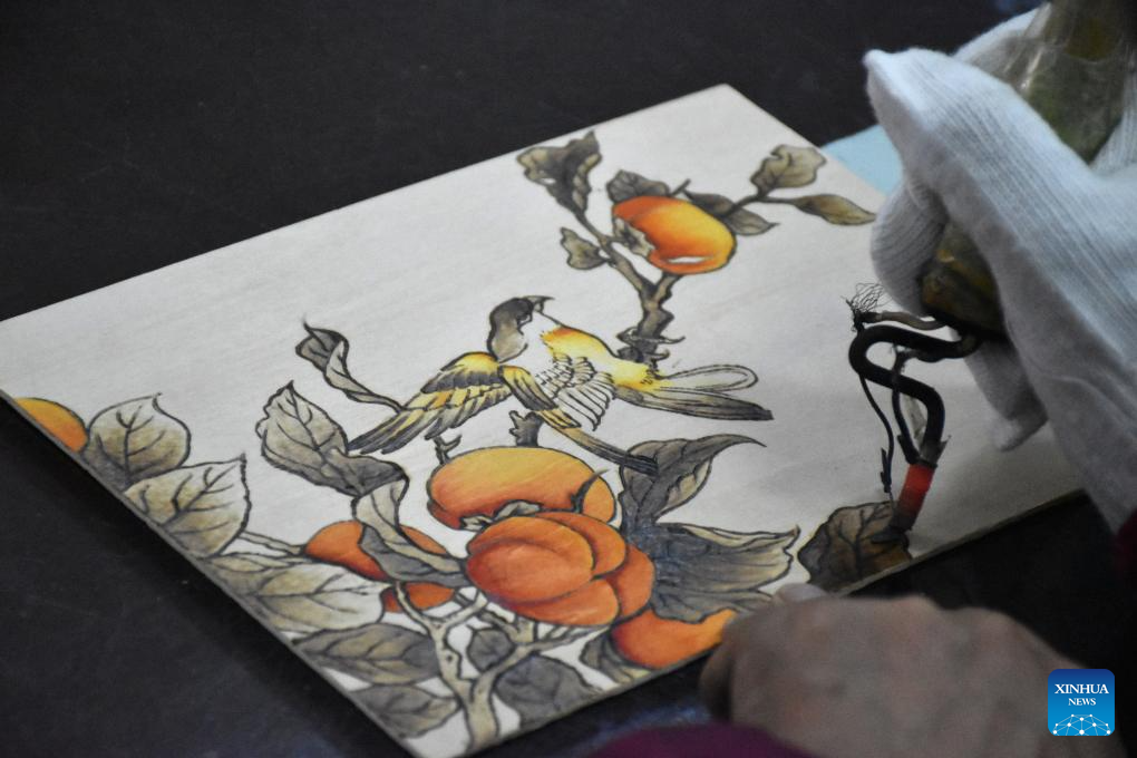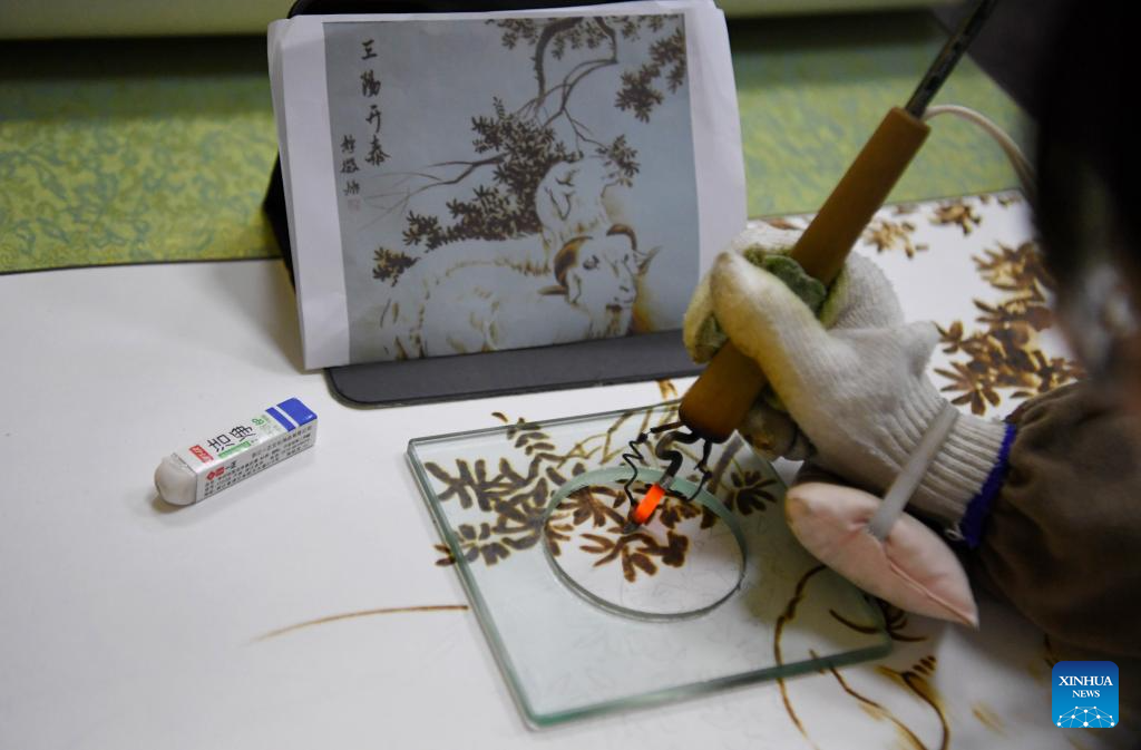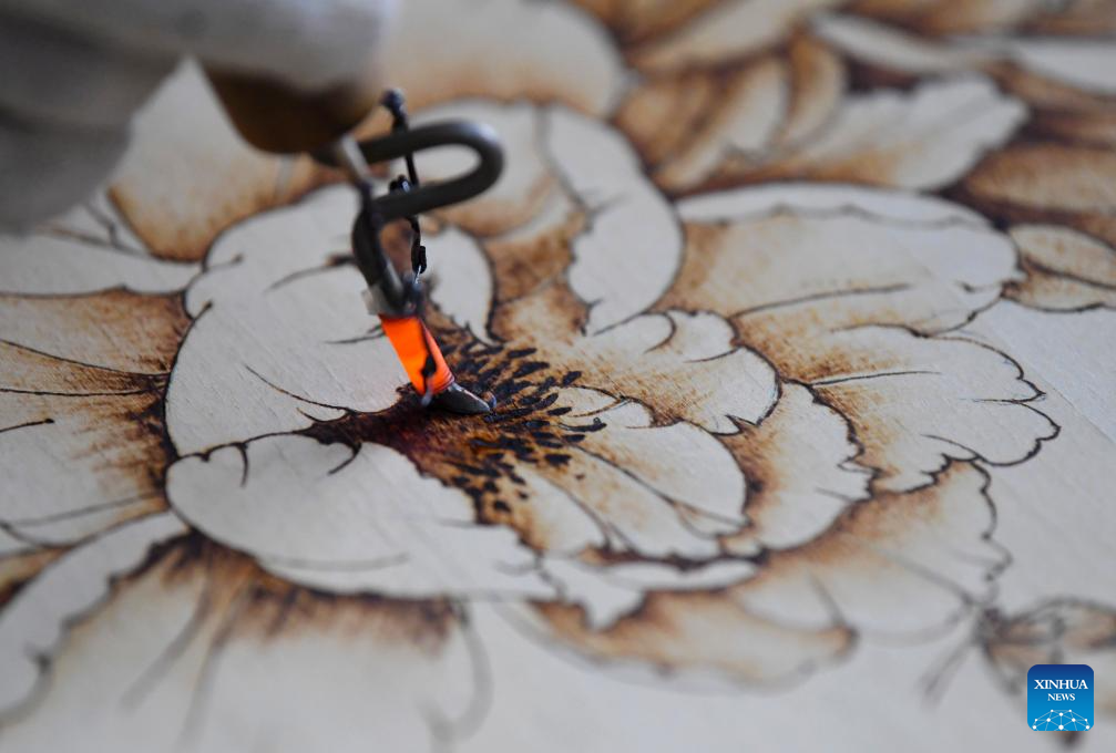 A lover of Nanyang pyrography makes an artwork of pyrography at a training class of Nanyang Pyrography Factory in Nanyang City, central China's Henan Province, March 14, 2024. (Xinhua/Hao Yuan)