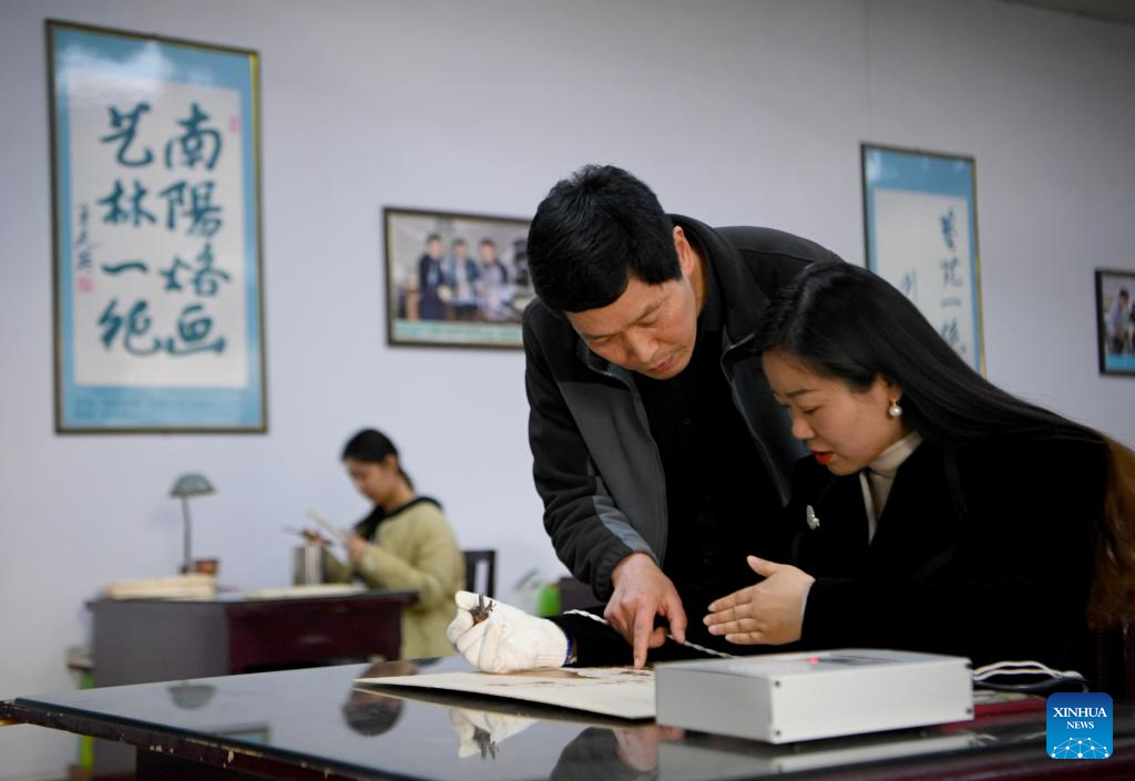 Li Zhe guides a lover of Nanyang pyrography to make an artwork of pyrography at a training class of Nanyang Pyrography Factory in Nanyang City, central China's Henan Province, March 14, 2024. (Xinhua/Hao Yuan)