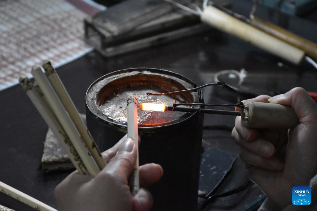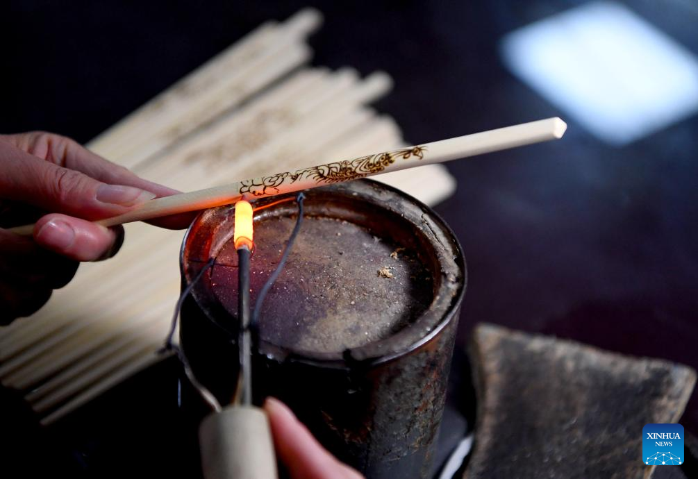 A lover of Nanyang pyrography makes an artwork of pyrography on a chopstick at a training class of Nanyang Pyrography Factory in Nanyang City, central China's Henan Province, March 14, 2024. (Xinhua/Hao Yuan)