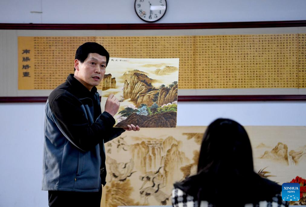 Li Zhe introduces the skills of making Nanyang pyrography at a training class of Nanyang Pyrography Factory in Nanyang City, central China's Henan Province, March 14, 2024. (Xinhua/Hao Yuan)