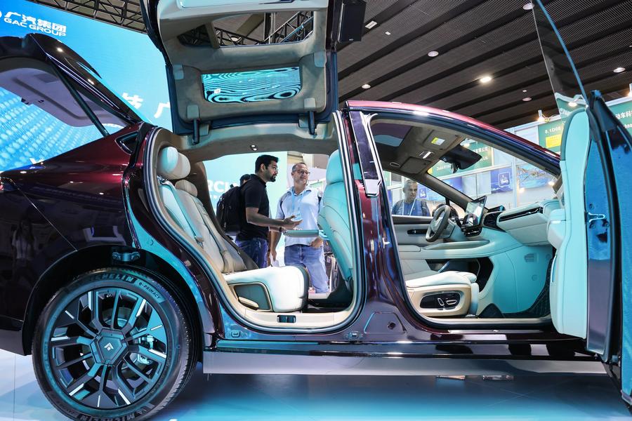 Visitors view a new energy vehicle during the 135th session of the China Import and Export Fair, also known as the Canton Fair, in Guangzhou, south China's Guangdong Province, April 15, 2024. (Xinhua/Liu Dawei)