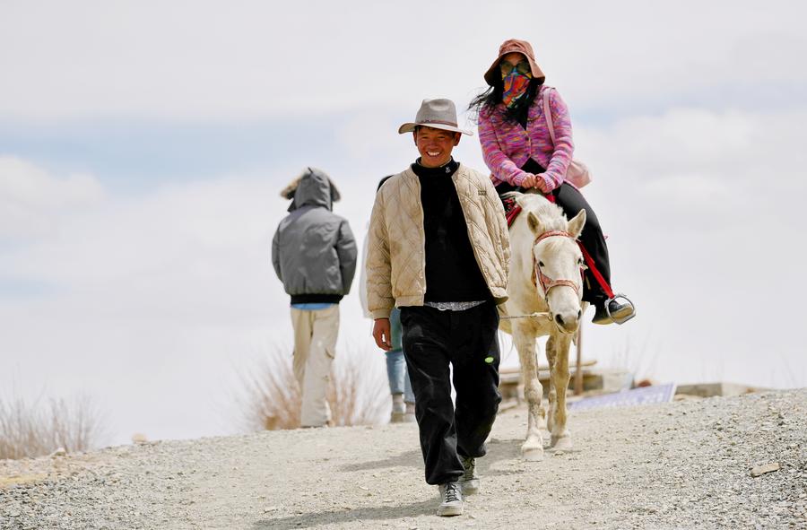 A tourist rides a horse by the Yamzbog Yumco Lake in southwest China's Xizang Autonomous Region, April 5, 2024. (Xinhua/Zhang Rufeng)