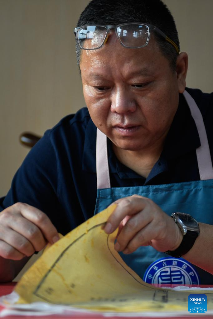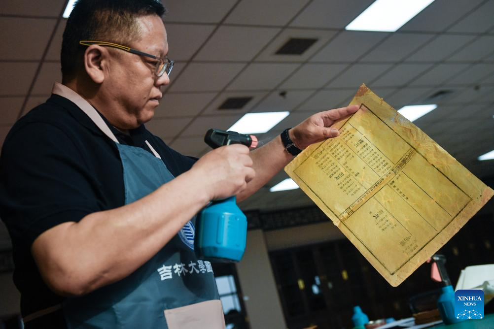 Zhang Hua, a restorer of ancient books in the library of Jilin University, prepares for the restoration of an ancient book at the library of Jilin University in Changchun, northeast China's Jilin Province, April 19, 2024. (Xinhua/Xu Chang)