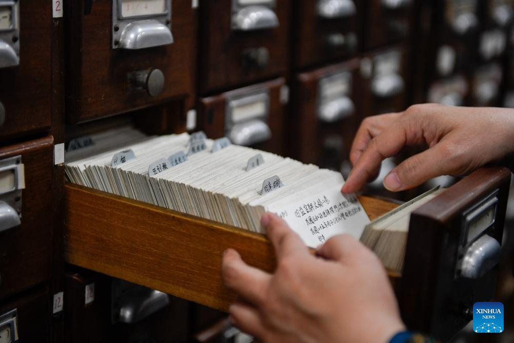 Wang Lihua, director of the ancient books department of Jilin University Library, looks through the catalogues for ancient books at the library of Jilin University in Changchun, northeast China's Jilin Province, April 19, 2024. (Xinhua/Xu Chang)