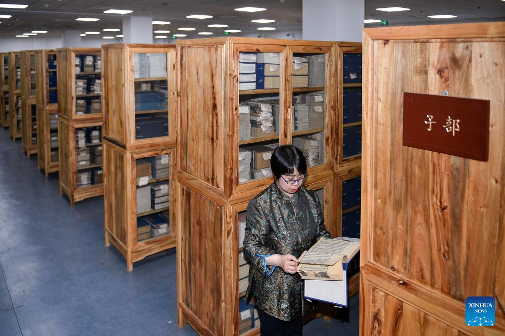 Wang Lihua, director of the ancient books department of Jilin University Library, checks the preservation of ancient books at the library of Jilin University in Changchun, northeast China's Jilin Province, April 19, 2024. (Xinhua/Xu Chang)