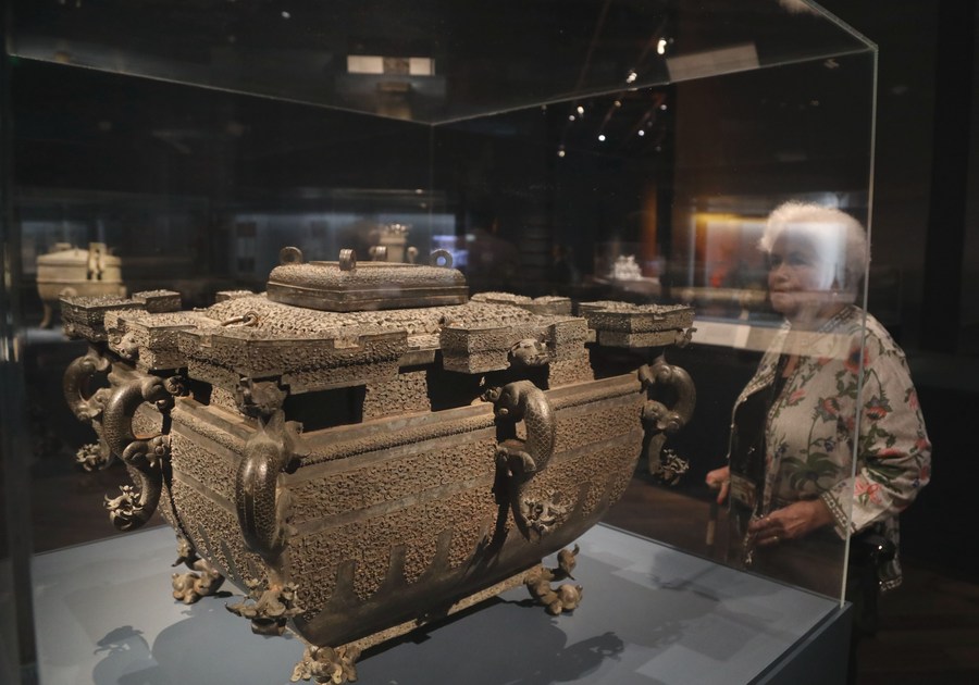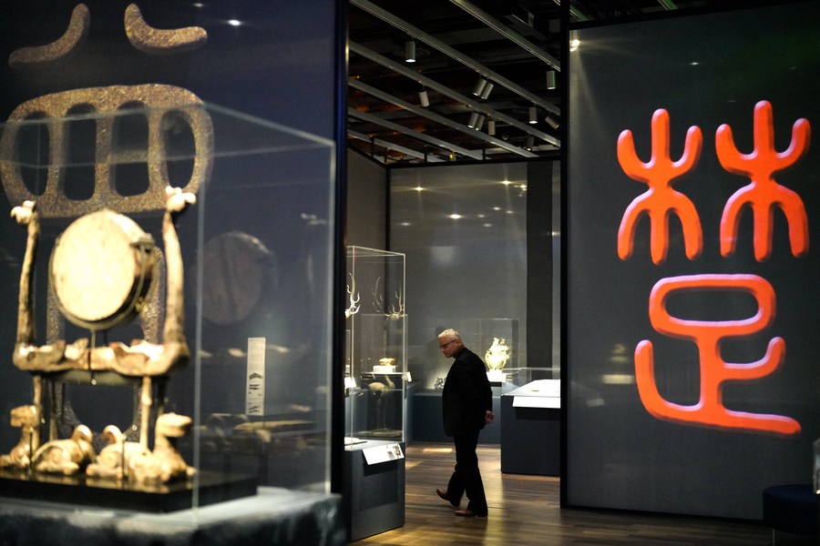 A visitor views exhibits at a major exhibition of Chinese cultural relics from China's Bronze Age in San Francisco, California, the United States, April 19, 2024. (Xinhua/Wu Xiaoling)