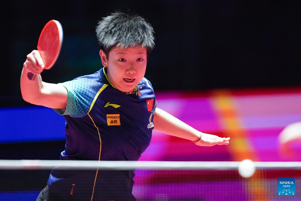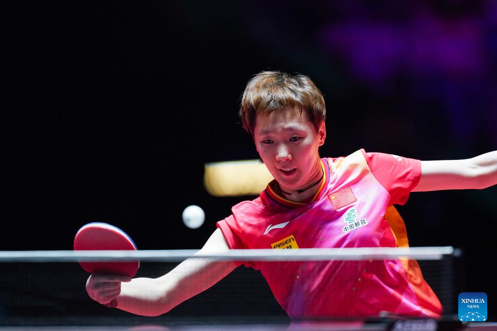 Sun Yingsha of China hits a return during the women's singles final match against her teammate Wang Manyu at the ITTF World Cup Macao 2024 at Galaxy Arena in Macao, China, April 21, 2024. (Xinhua/Wang Shen)