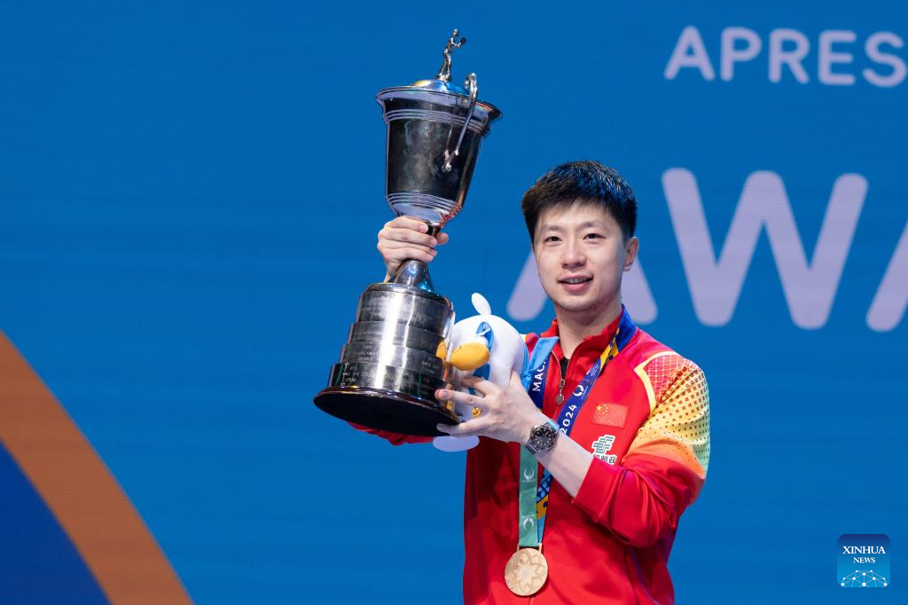 Men's singles event winner China's Ma Long poses during the awarding ceremony of the ITTF World Cup Macao 2024 at Galaxy Arena in Macao, China, April 21, 2024. (Xinhua/Cheong Kam Ka)