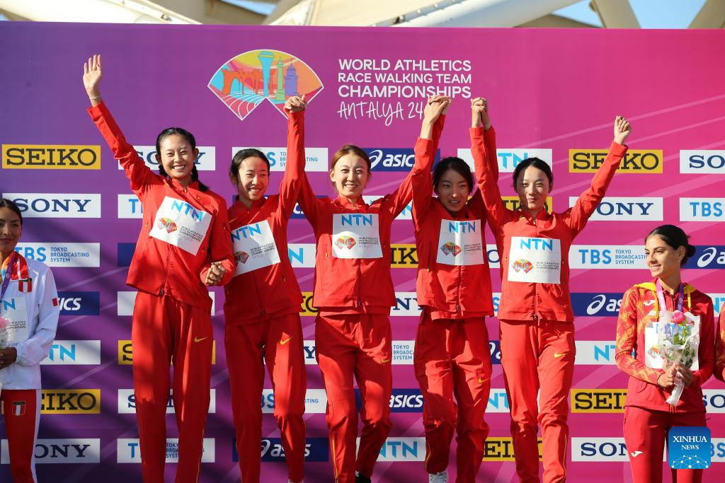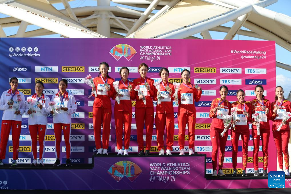 Team China celebrate during the awarding ceremony for women's team 20km race walk at the 2024 World Athletics Race Walking Team Championships in Antalya, Türkiye, April 21, 2024. (Mustafa Kaya/Handout via Xinhua)