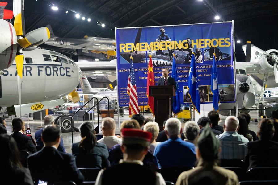 The Chinese Consul General in New York Huang Ping speaks during a photo exhibition commemorating the Flying Tigers and Doolittle Raiders, Americans who fought Japan in World War II in cooperation with the Chinese people, at the National Museum of the U.S. Air Force in Dayton, Ohio, the United States, April 18, 2024. (Xinhua/Liu Jie)