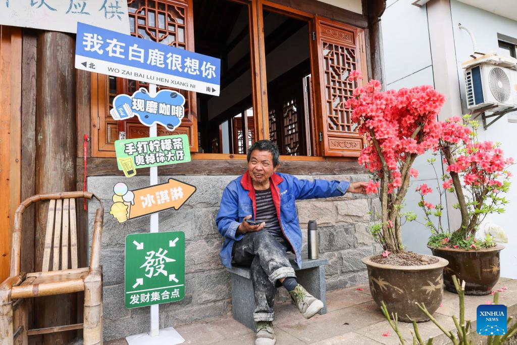 A villager takes a rest in front of a homestay at Bailu Village of Luting Township, Yuyao City, east China's Zhejiang Province, April 13, 2024. (Xinhua/Lan Hongguang)