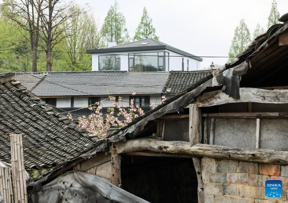 This photo taken on April 13, 2024 compares the old residence (front) and the new residence (rear) of the same household at Bailu Village in Luting Township, Yuyao City, east China's Zhejiang Province. (Xinhua/Lan Hongguang)