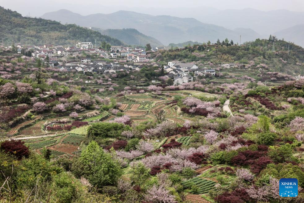 Cherry blossoms are pictured at a scenic area in Luting Township, Yuyao City, east China's Zhejiang Province, April 13, 2024. (Xinhua/Lan Hongguang)