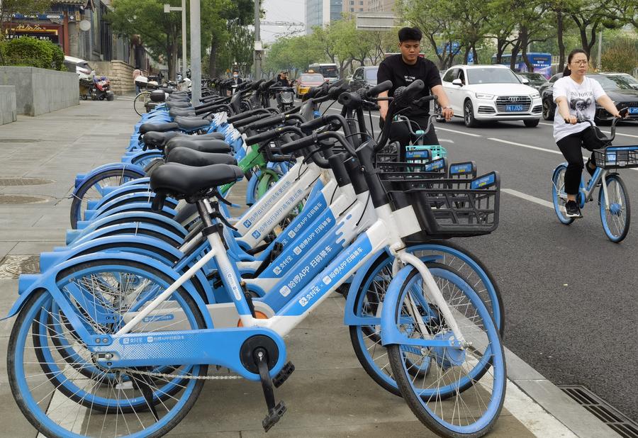 Citizens ride past a row of sharing bikes of Hellobike in Beijing, capital of China, April 22, 2024. (Xinhua/Hong Zehua)