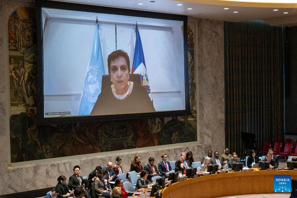 The UN Security Council holds a meeting on the situation in Haiti at the UN headquarters in New York, on April 22, 2024. The top UN envoy for Haiti Maria Isabel Salvador on Monday stressed the need for improved security in the country to allow for further political progress. (Manuel Elias/UN Photo/Handout via Xinhua)