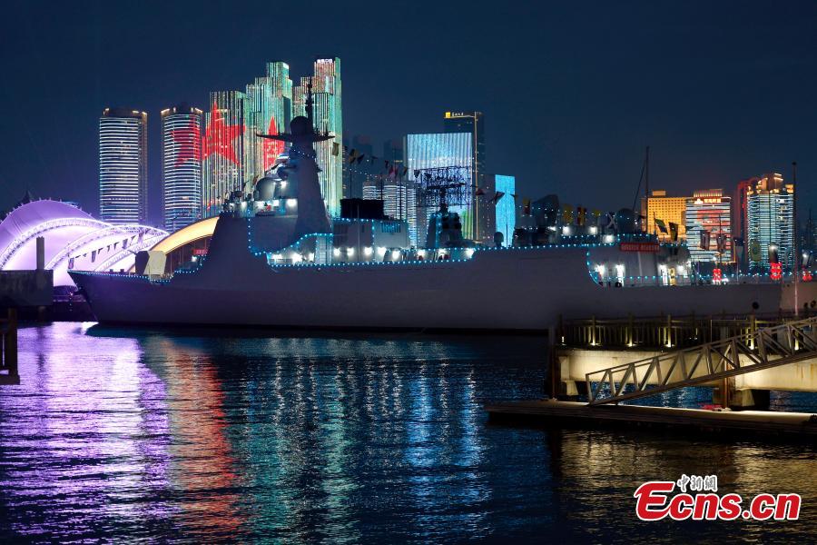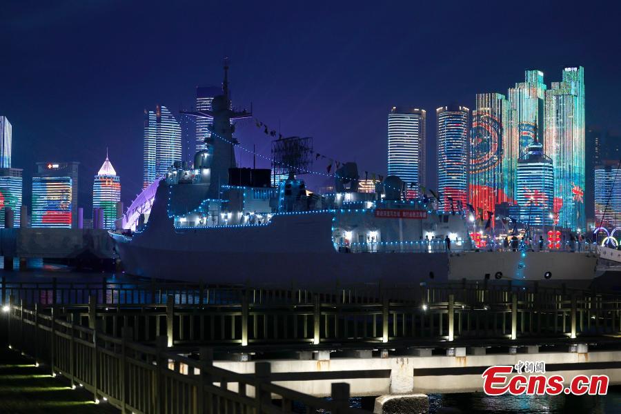 Qingdao illuminated in celebration of 75th founding anniversary of Chinese PLA navy