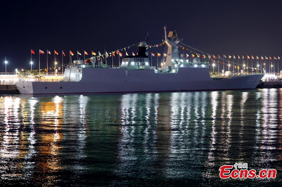 Night view of the guided-missile destroyer Kaifeng of the People's Liberation Army (PLA) navy at the Qingdao International Sailing Center pier in east China's Shandong Province, April 22, 2024. (Photo: China News Service/Fu Tian)