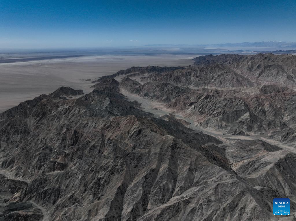 An aerial drone photo taken on April 21, 2024 shows a view of Heidu Mountain in Lenghu Town in the Mongolian-Tibetan Autonomous Prefecture of Haixi, northwest China's Qinghai Province. The Qaidam Basin in northwest China is home to a unique landscape which consists of salt lakes, the Gobi desert and the wind-eroded rocks known as yardang. (Xinhua/Zhang Long)