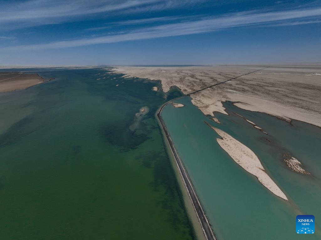 An aerial drone photo taken on April 22, 2024 shows a view of Xi Taijnar Lake in the Mongolian-Tibetan Autonomous Prefecture of Haixi, northwest China's Qinghai Province. The Qaidam Basin in northwest China is home to a unique landscape which consists of salt lakes, the Gobi desert and the wind-eroded rocks known as yardang. (Xinhua/Zhang Long)