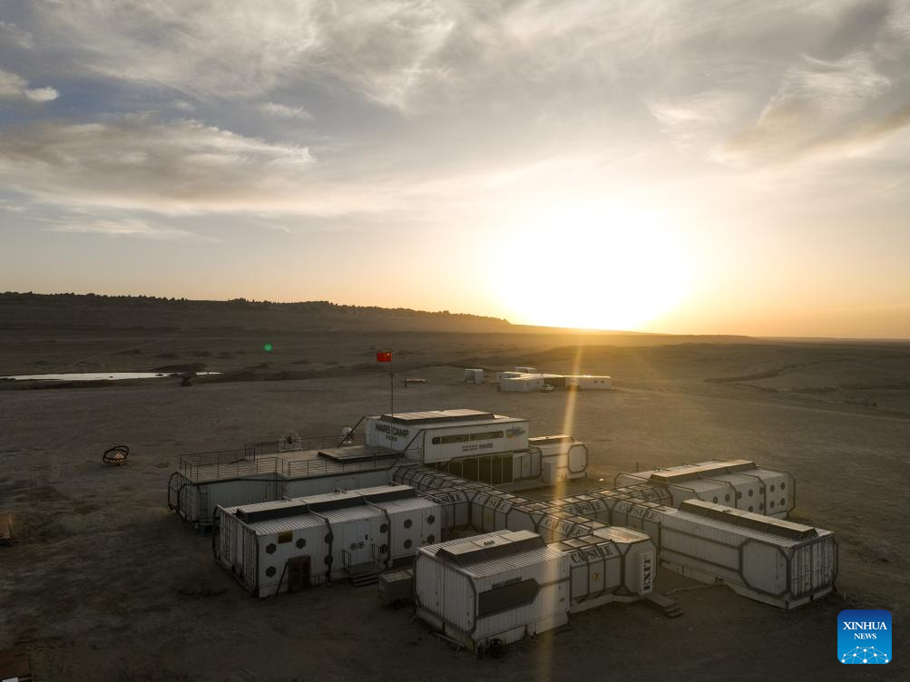 An aerial drone photo taken on April 21, 2024 shows the Mars-themed educational facility called "Mars Camp" in Lenghu Town in the Mongolian-Tibetan Autonomous Prefecture of Haixi, northwest China's Qinghai Province. The Qaidam Basin in northwest China is home to a unique landscape which consists of salt lakes, the Gobi desert and the wind-eroded rocks known as yardang. (Xinhua/Zhang Long)