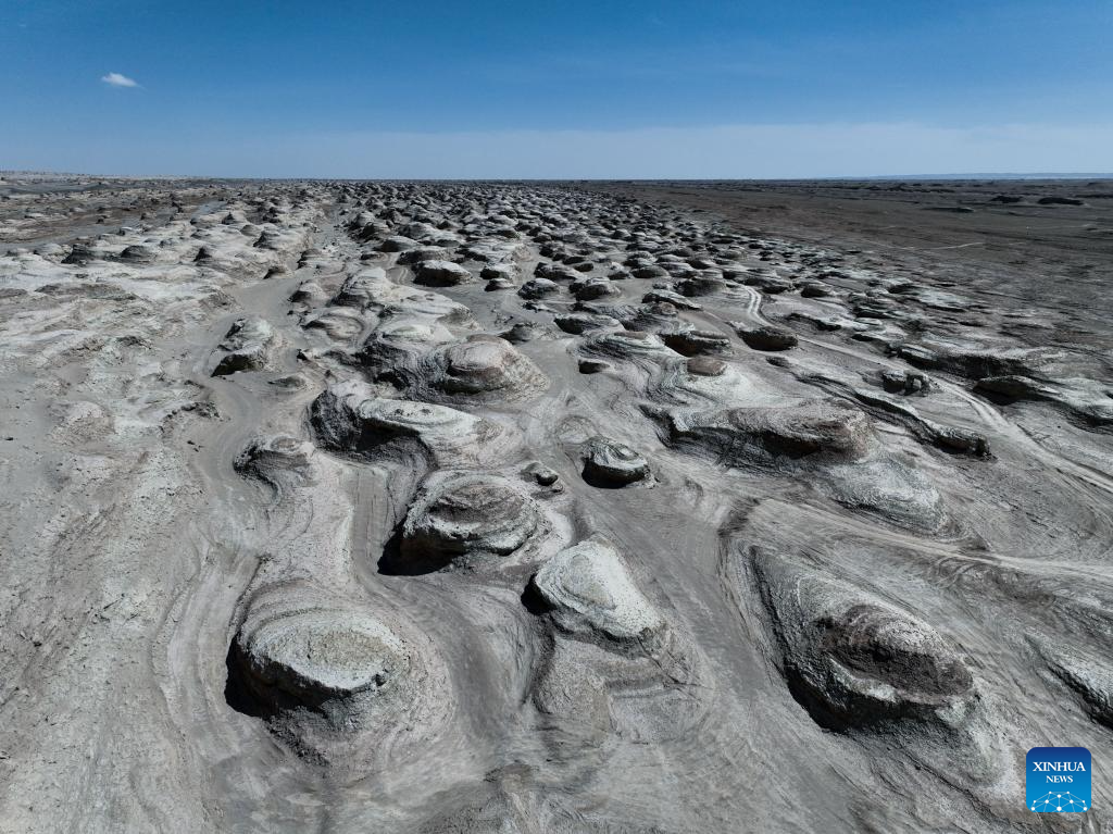 An aerial drone photo taken on April 22, 2024 shows a view of Wusute Yardang geological park in the Mongolian-Tibetan Autonomous Prefecture of Haixi, northwest China's Qinghai Province. The Qaidam Basin in northwest China is home to a unique landscape which consists of salt lakes, the Gobi desert and the wind-eroded rocks known as yardang. (Xinhua/Zhang Long)