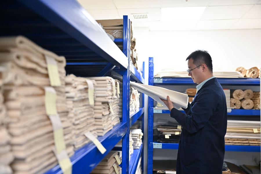 Gao Xuemiao selects paper materials for ancient book restoration at Tianjin Library in north China's Tianjin Municipality, April 22, 2024. (Xinhua/Sun Fanyue)