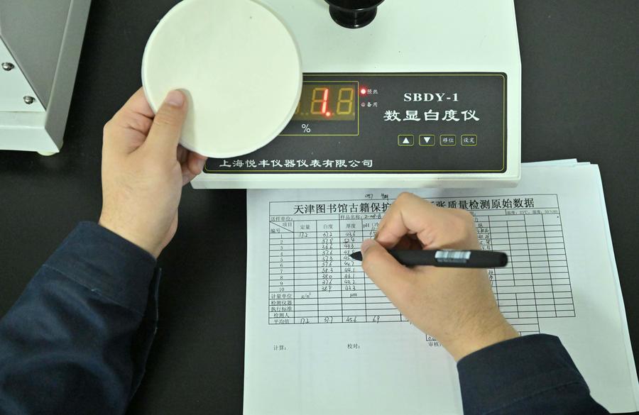 Gao Xuemiao measures the value of paper fibers at the laboratory of Tianjin Library in north China's Tianjin Municipality, April 18, 2024. (Xinhua/Sun Fanyue)