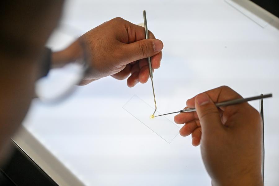 Gao Xuemiao prepares agent for experiment at the laboratory of Tianjin Library in north China's Tianjin Municipality, April 18, 2024. (Xinhua/Sun Fanyue)