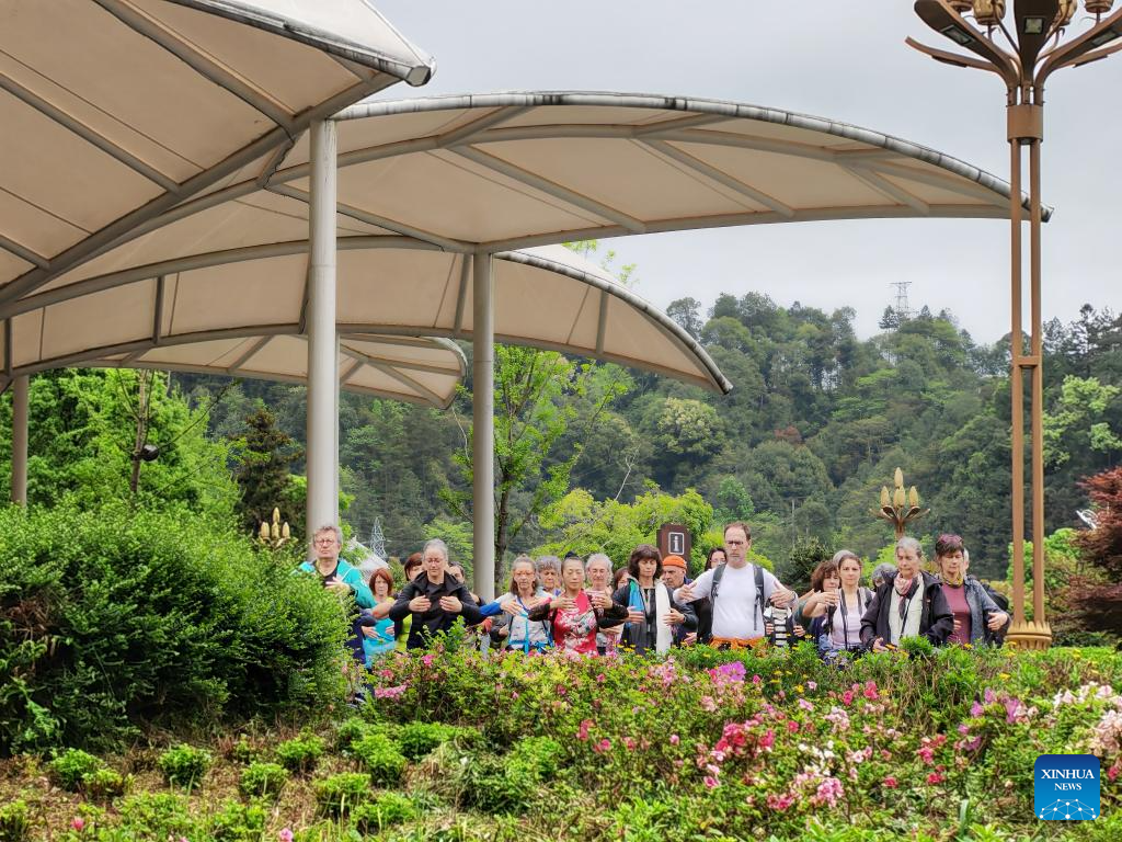 French martial arts enthusiasts practice traditional Chinese Qigong breathing exercises at the Mount Fanjingshan in Tongren City, southwest China's Guizhou Province, April 13, 2024. (Xinhua/Wu Si)