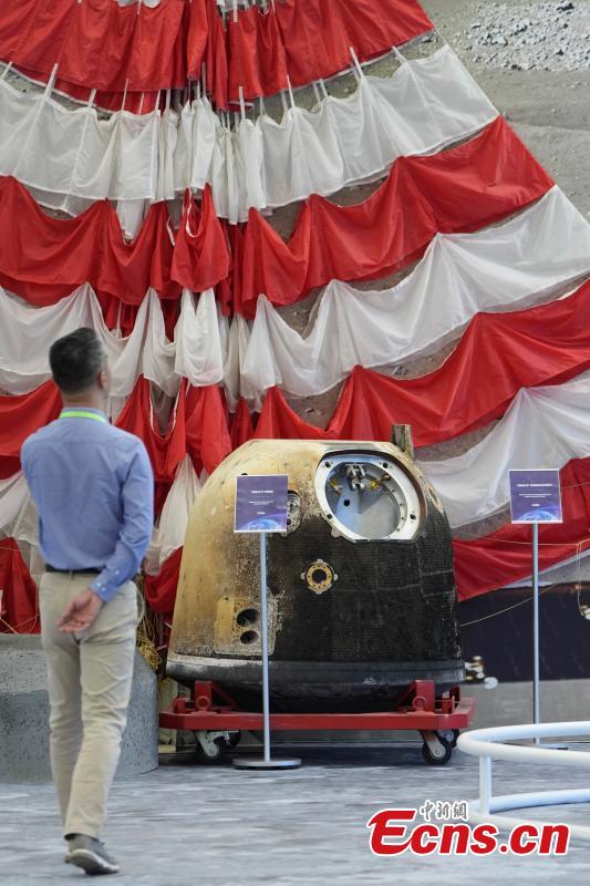 Photo shows the return capsule of China's "Chang'e 5" lunar mission, along with the main parachute used for landing on an exhibition to celebrate the Space Day of China in Wuhan, Central China's Hubei Province, April 23, 2024. (Photo: China News Service/Cui Nan)