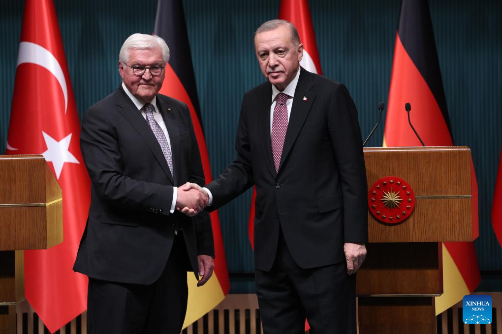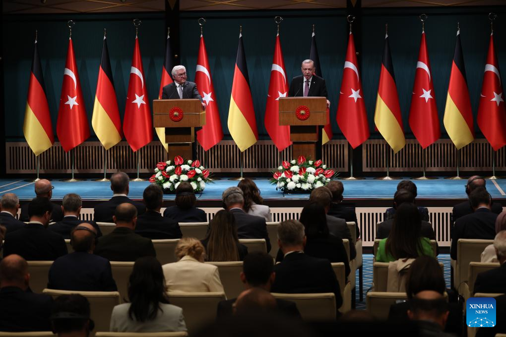 Turkish President Recep Tayyip Erdogan (R) and German President Frank-Walter Steinmeier hold a joint press conference in Ankara, Türkiye, on April 24, 2024. Turkish President Recep Tayyip Erdogan on Wednesday called for greater cooperation between Türkiye and Germany in the defense industry. (Photo by Mustafa Kaya/Xinhua)