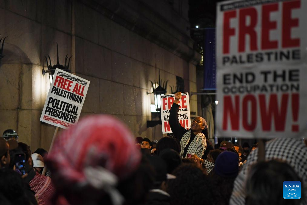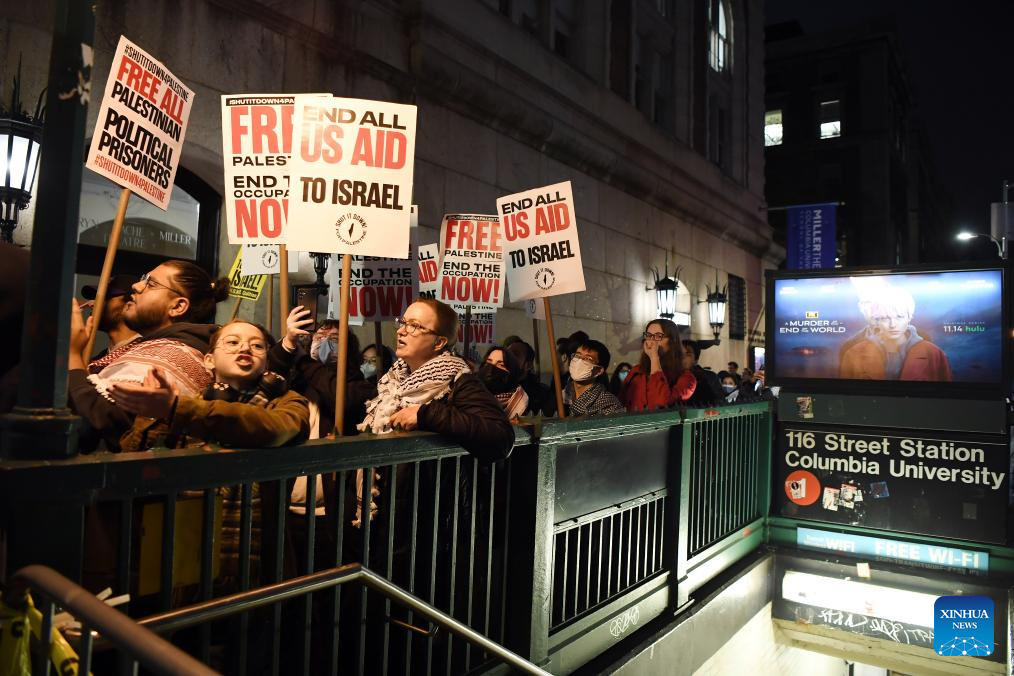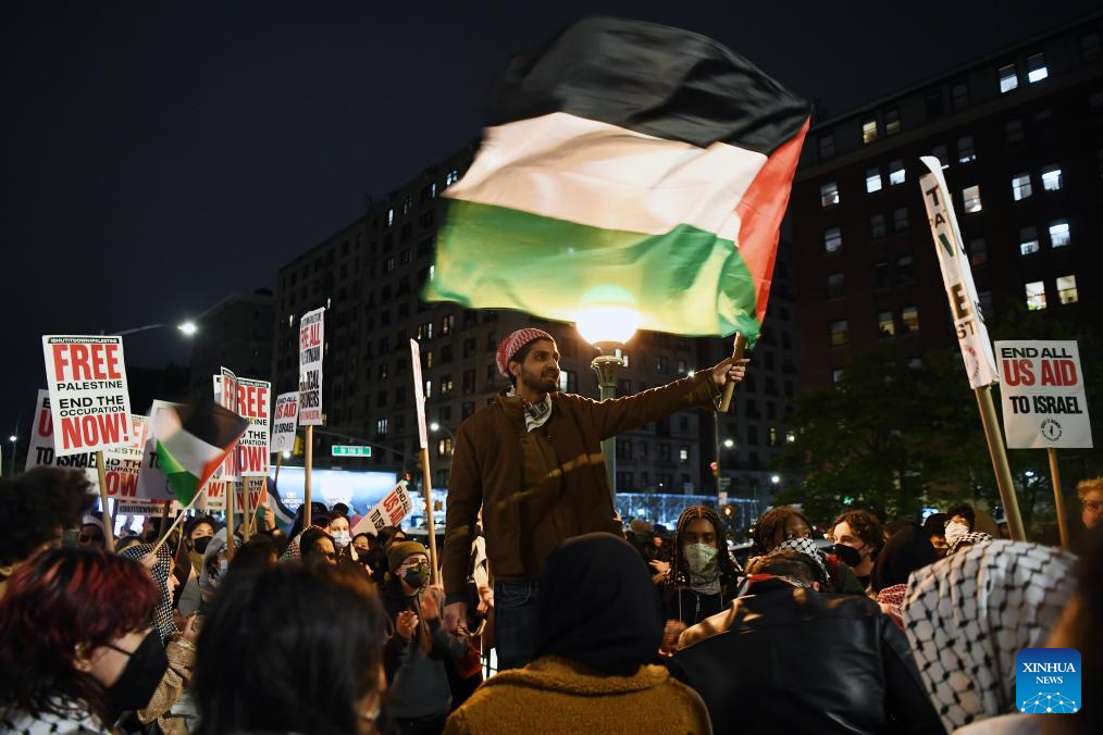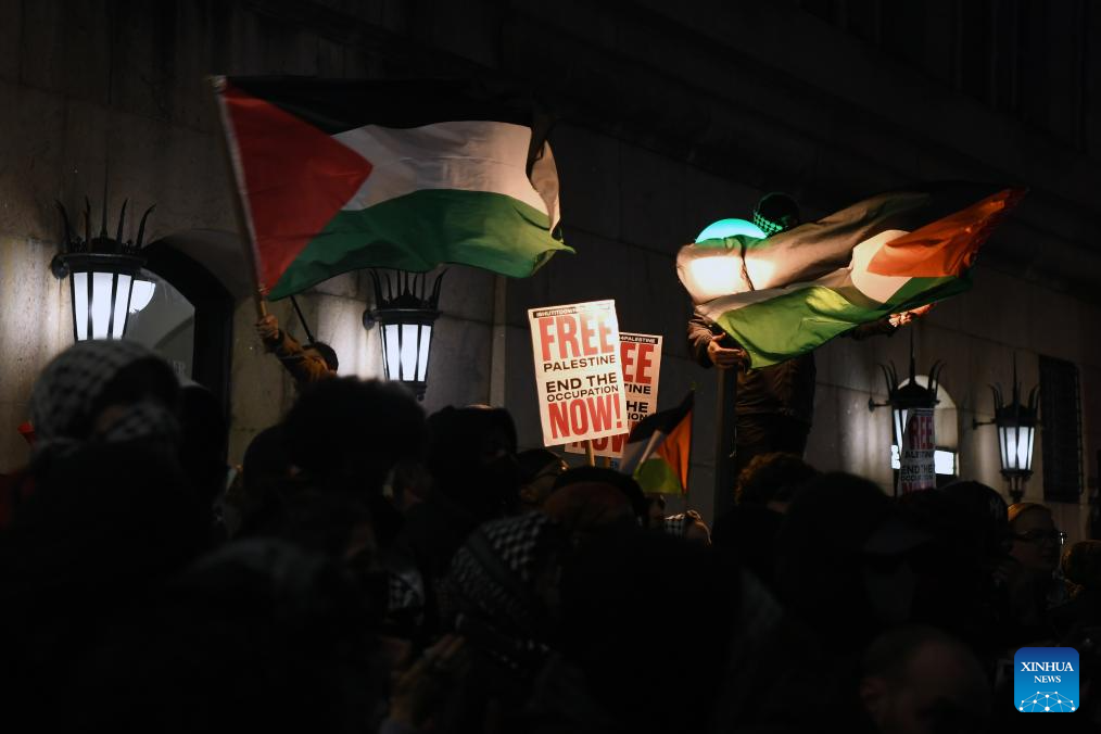 People participate in a pro-Palestinian demonstration outside Columbia University in New York, the United States, on April 24, 2024. Columbia University, amidst an eighth day of tense demonstrations, said on Wednesday that it has extended negotiations with student activists regarding the dismantling of a pro-Palestinian encampment. (Xinhua/Li Rui)