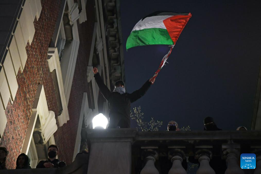 A man waves a Palestinian flag during a pro-Palestinian demonstration at Columbia University in New York, the United States, on April 23, 2024. Columbia University, amidst an eighth day of tense demonstrations, said on Wednesday that it has extended negotiations with student activists regarding the dismantling of a pro-Palestinian encampment. (Xinhua/Li Rui)