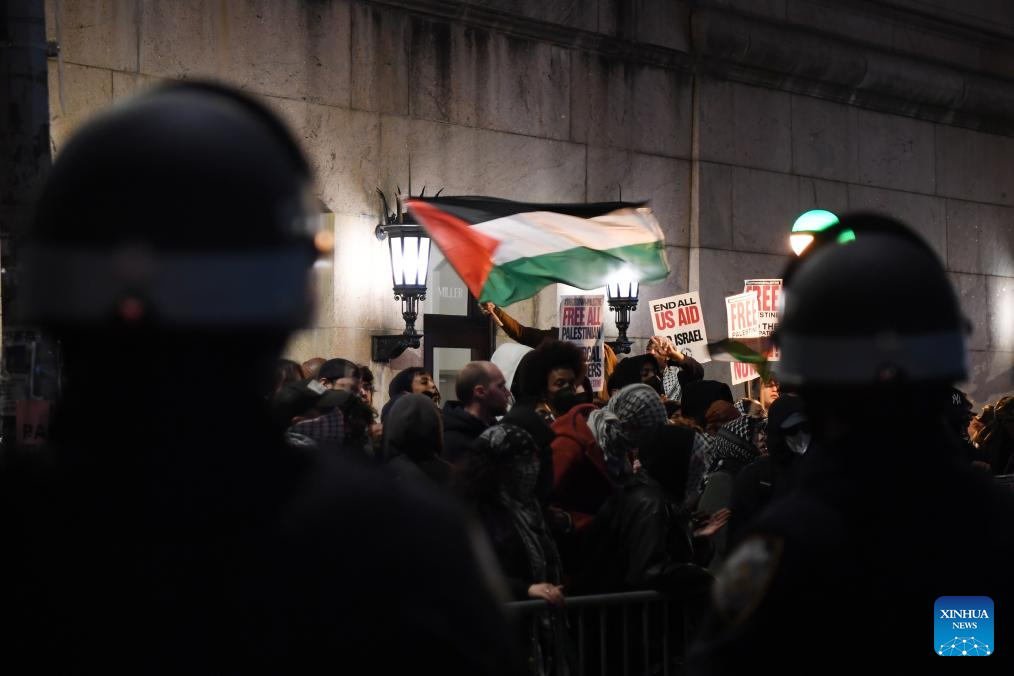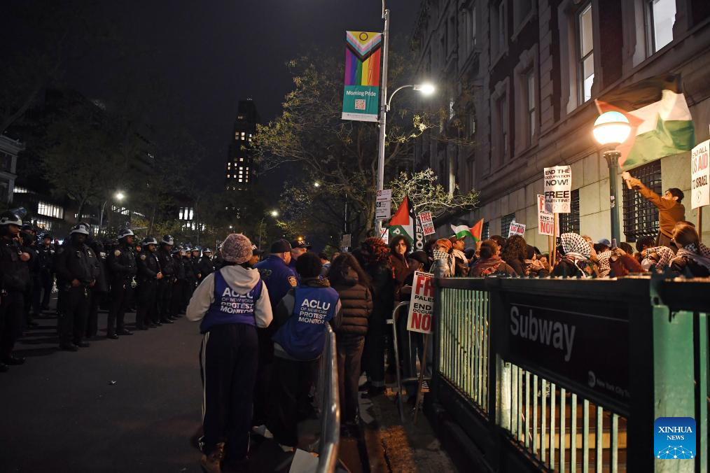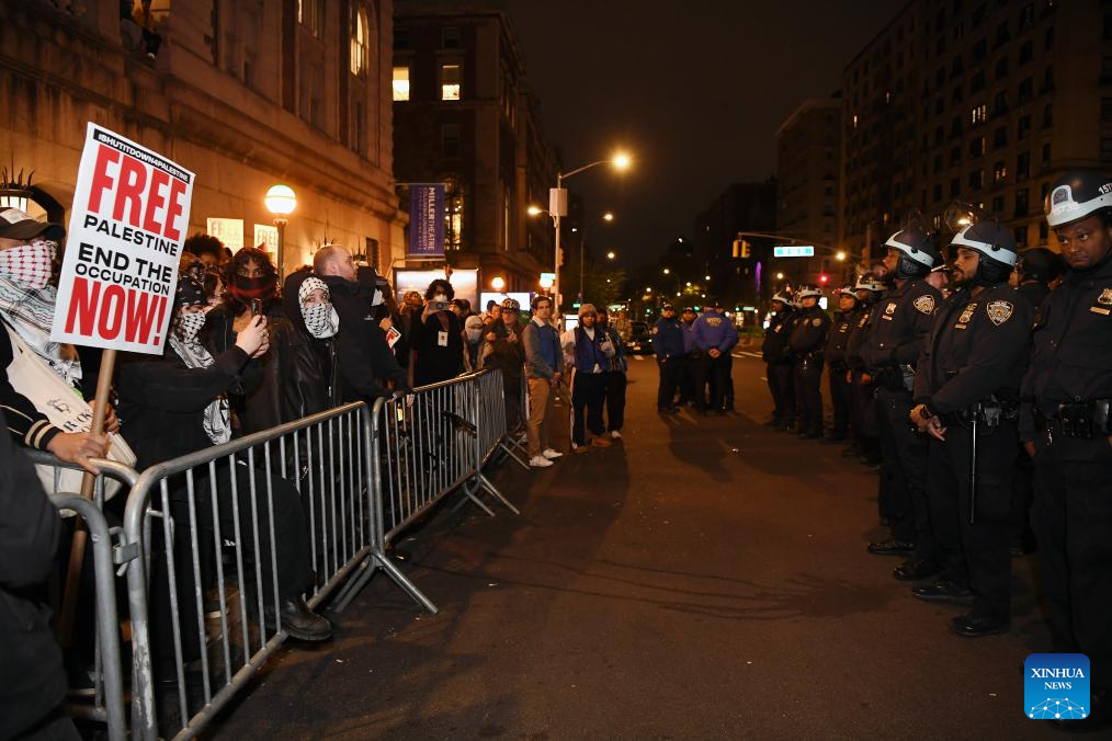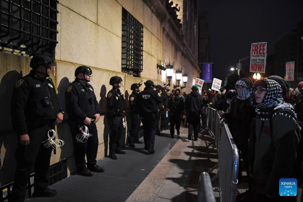 People participate in a pro-Palestinian demonstration as police officers stand guard outside Columbia University in New York, the United States, on April 24, 2024. Columbia University, amidst an eighth day of tense demonstrations, said on Wednesday that it has extended negotiations with student activists regarding the dismantling of a pro-Palestinian encampment. (Xinhua/Li Rui)