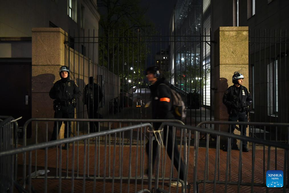 Police officers stand guard at a gate of Columbia University in New York, the United States, on April 24, 2024. Columbia University, amidst an eighth day of tense demonstrations, said on Wednesday that it has extended negotiations with student activists regarding the dismantling of a pro-Palestinian encampment. (Xinhua/Li Rui)