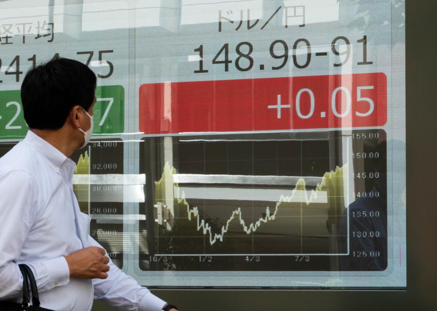A man watches a board showing exchange rate in Tokyo, Japan, Sept. 26, 2023. (Xinhua/Zhang Xiaoyu)