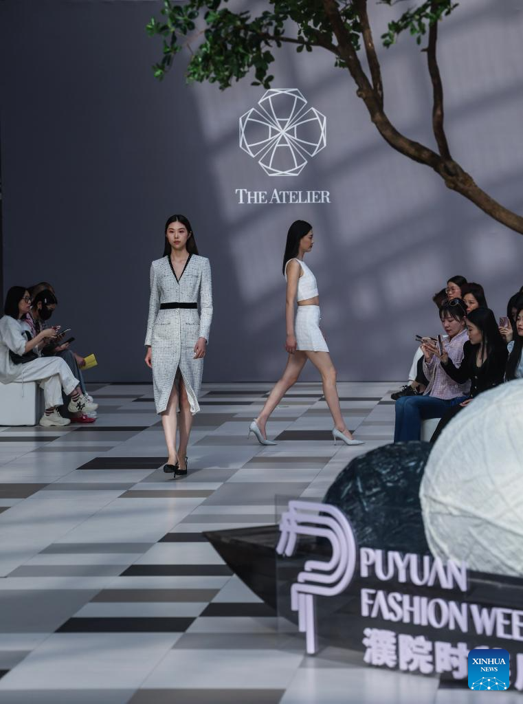 Models present creations at THE ATELIER show during the Puyuan fashion week at the Puyuan Fashion Resort in Puyuan Town of Tongxiang City, east China's Zhejiang Province, April 24, 2024. Puyuan is a major knitwear center in China with strong manufacturing capability. The fashion week is held here on Wednesday, hoping to put local knitwear on the global fashion podium. (Xinhua/Xu Yu)