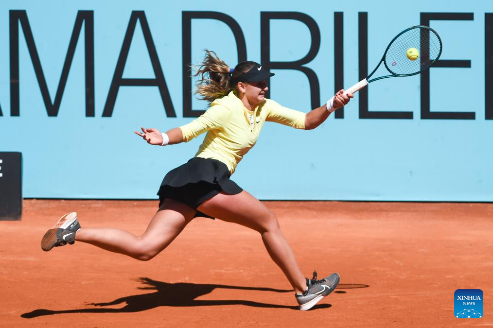 Victoria Jimenez of Andorra hits a return to Zhu Lin of China during the women's singles first round match of 2024 Madrid Open tennis tournament in Madrid, Spain, April 25, 2024. (Photo by Gustavo Valiente/Xinhua)