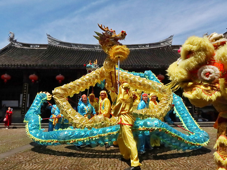 Dragon and lion dances staged in Chongren ancient town on Wednesday. [Photo by Jiang Dong/China Daily]