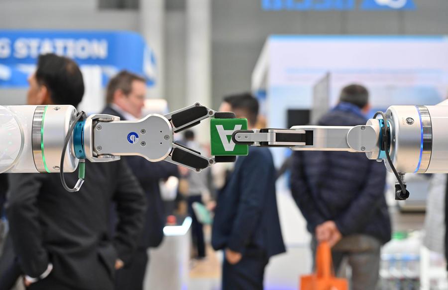 Robots transfer an item at Hannover Messe in Hannover, Germany, on April 23, 2024. (Xinhua/Ren Pengfei)