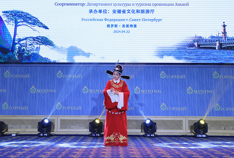 An artist performs a Huangmei Opera classic titled "Emperor's Female Son-in-Law" at a cultural and tourism promotional event for east China's Anhui Province held in St. Petersburg, Russia, April 22, 2024. (Photo courtesy of the Department of Culture and Tourism of Anhui Province)