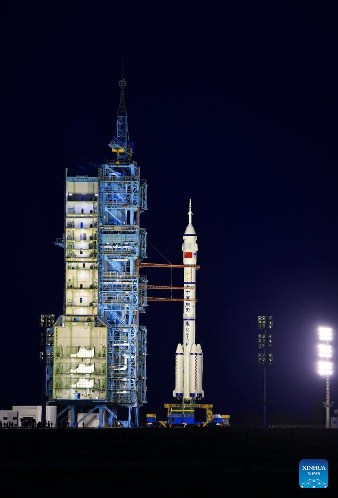 This photo shows the Shenzhou-18 manned spaceship atop a Long March-2F carrier rocket at the Jiuquan Satellite Launch Center in northwest China, April 25, 2024. (Xinhua/Li Gang)
