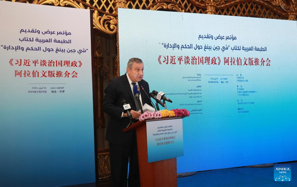 Former Egyptian Prime Minister Essam Sharaf delivers a speech during a promotion event for the Arabic edition of "Xi Jinping: The Governance of China" in Cairo, Egypt, April 24, 2024. Over 100 representatives from China and Arab countries attended the event held here on Wednesday. (Xinhua/Sui Xiankai)