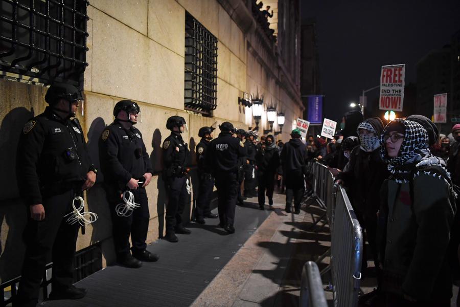 People participate in a pro-Palestinian demonstration as police officers stand guard outside Columbia University in New York, the United States, on April 24, 2024. (Xinhua/Li Rui)