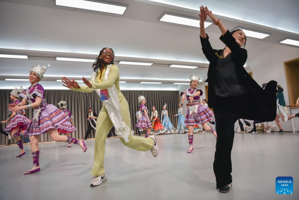 Students of the Muscatine High School delegation practice an ethnic dance with Chinese students at the High School Affiliated to Beijing Normal University in Beijing, capital of China, April 18, 2024. A total of 32 students and eight teachers from Muscatine High School, in the U.S. state of Iowa recently attended a week-long study tour to Beijing, Hebei and Shanghai. The Muscatine High School delegation is part a China-initiated program that will invite 50,000 American youths to China within five years for exchanges and study. The delegation is the second batch from the school. (Photo by Liu Zunshuan/Xinhua)
