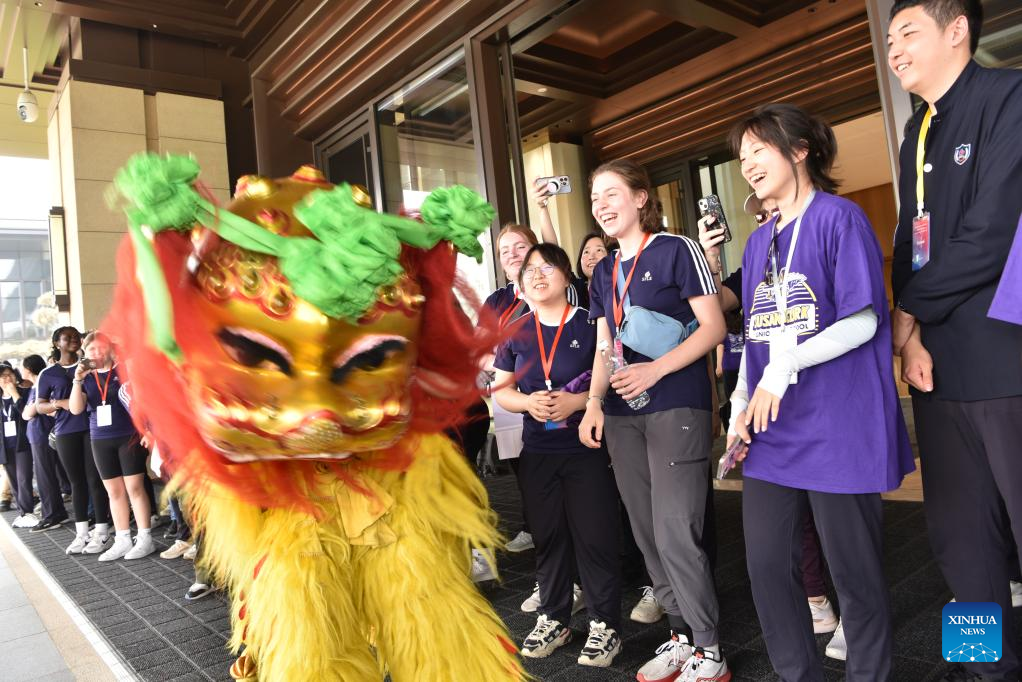 Students of the Muscatine High School delegation watch a lion dance performance at the Xiong'an New Area in north China's Hebei Province, April 22, 2024. A total of 32 students and eight teachers from Muscatine High School, in the U.S. state of Iowa recently attended a week-long study tour to Beijing, Hebei and Shanghai. The Muscatine High School delegation is part a China-initiated program that will invite 50,000 American youths to China within five years for exchanges and study. The delegation is the second batch from the school. (Photo by Liu Zunshuan/Xinhua)