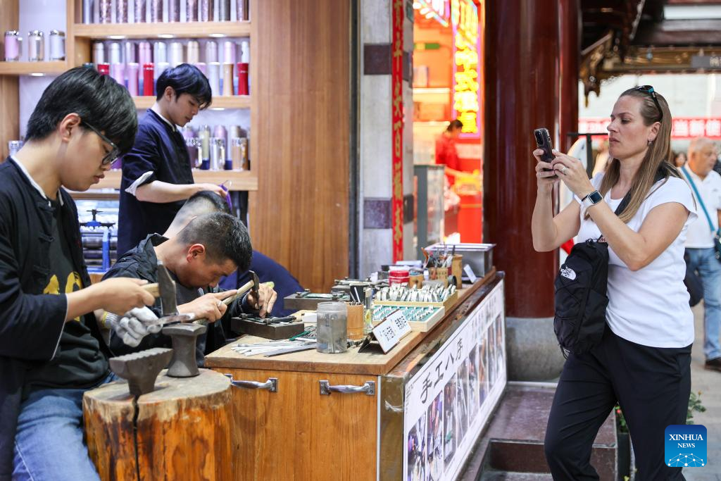A teacher of the Muscatine High School delegation takes photos of silverwork making in east China's Shanghai, April 23, 2024. A total of 32 students and eight teachers from Muscatine High School, in the U.S. state of Iowa recently attended a week-long study tour to Beijing, Hebei and Shanghai. The Muscatine High School delegation is part a China-initiated program that will invite 50,000 American youths to China within five years for exchanges and study. The delegation is the second batch from the school. (Xinhua/Wang Xiang)