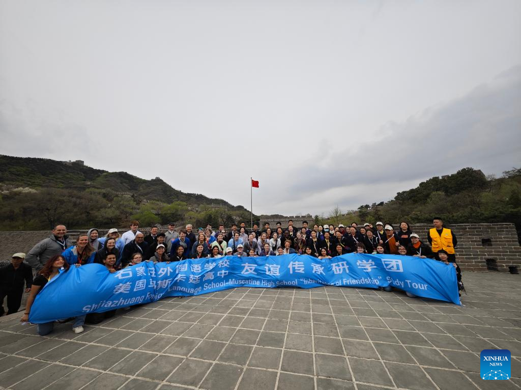 The Muscatine High School delegation poses for a group photo at the Badaling Great Wall in Beijing, capital of China, April 19, 2024. A total of 32 students and eight teachers from Muscatine High School, in the U.S. state of Iowa recently attended a week-long study tour to Beijing, Hebei and Shanghai. The Muscatine High School delegation is part a China-initiated program that will invite 50,000 American youths to China within five years for exchanges and study. The delegation is the second batch from the school. (Xinhua/Bai Lin)