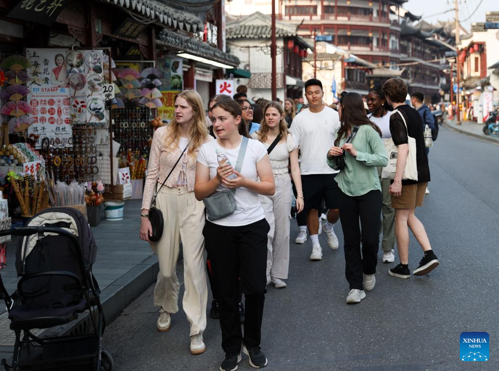 Students of the Muscatine High School delegation stroll along a street near the Yuyuan Garden in east China's Shanghai, April 23, 2024. A total of 32 students and eight teachers from Muscatine High School, in the U.S. state of Iowa recently attended a week-long study tour to Beijing, Hebei and Shanghai. The Muscatine High School delegation is part a China-initiated program that will invite 50,000 American youths to China within five years for exchanges and study. The delegation is the second batch from the school. (Xinhua/Wang Xiang)