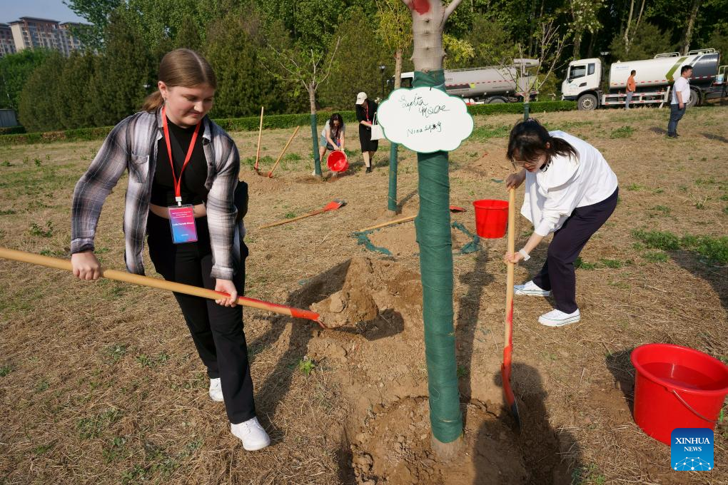 Chinese and American students plant a tree in Zhengding, north China's Hebei Province, April 20, 2024. A total of 32 students and eight teachers from Muscatine High School, in the U.S. state of Iowa recently attended a week-long study tour to Beijing, Hebei and Shanghai. The Muscatine High School delegation is part a China-initiated program that will invite 50,000 American youths to China within five years for exchanges and study. The delegation is the second batch from the school. (Xinhua/Zhang Can)